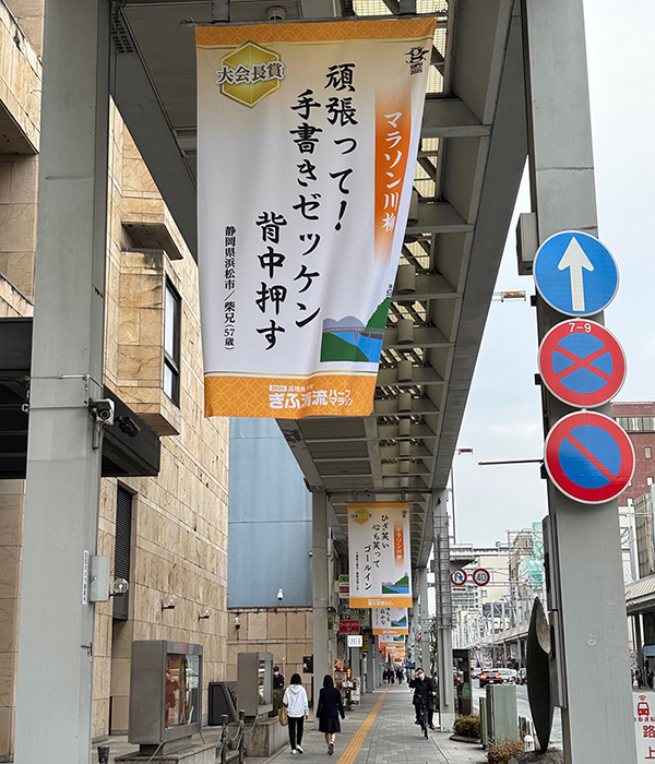 入選作品は、ぎふ清流ハーフマラソン2025マラソンEXPO(岐阜メモリアルセンター)での掲示や名鉄岐阜駅周辺などの神田町商店街でのフラッグ掲示をいたします。ぜひご覧ください!