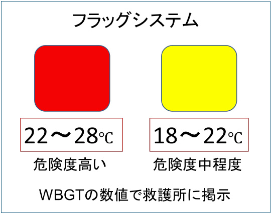 - 警戒レベルが「中程度」を示す18~22℃の時は「黄色」の旗が掲示されます。ペースを落とし、状況の悪化に備えてください。