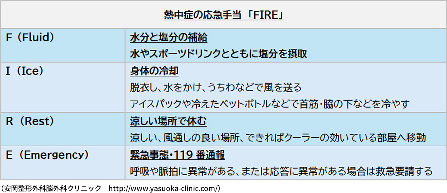 熱中症の症状に対しては、程度に応じて以下の手当てを参考にしてください。